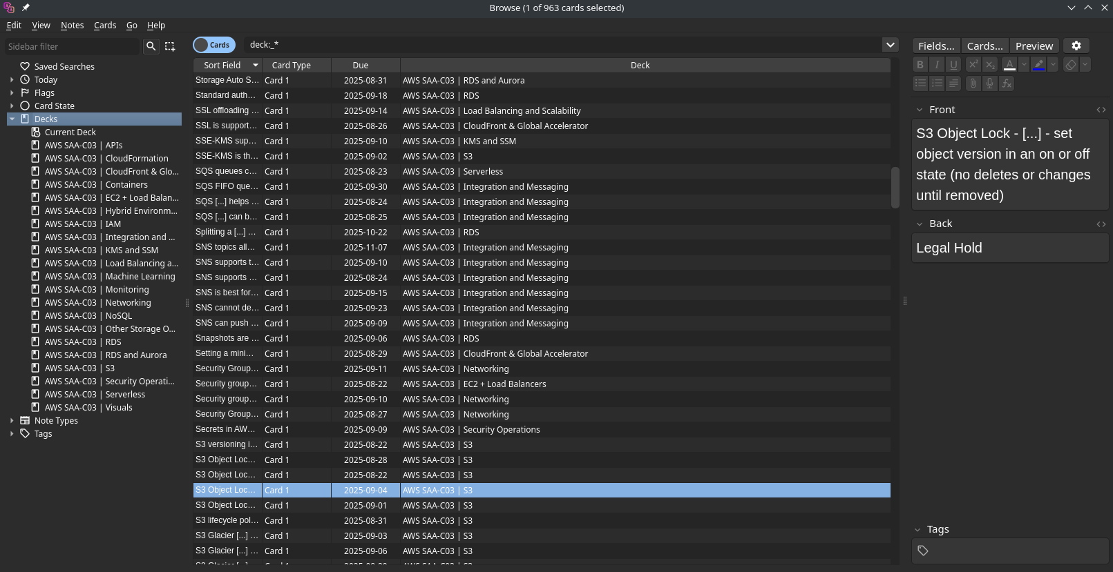 From May to August, I really focused. I reengaged with Adrian Cantrill’s course and Stephane Maarek’s course, and spent some quality time with Joe Bonso’s practice exams through Tutorials Dojo. I made close to around 1000 individual Anki flashcards.